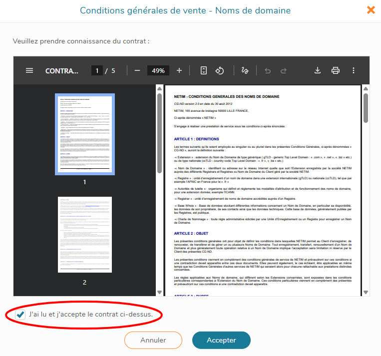 Dans la fenêtre qui s’ouvre, vous accédez à la version .PDF du contrat. En bas, cochez la case « J’ai lu et j’accepte le contrat ci-dessus », puis cliquez sur « Accepter »