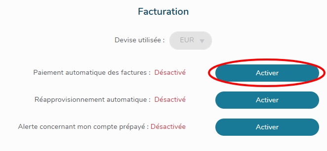 - Puis dans « Facturation » cliquez sur le bouton « Activer » en face de la section « Paiement automatique des factures »